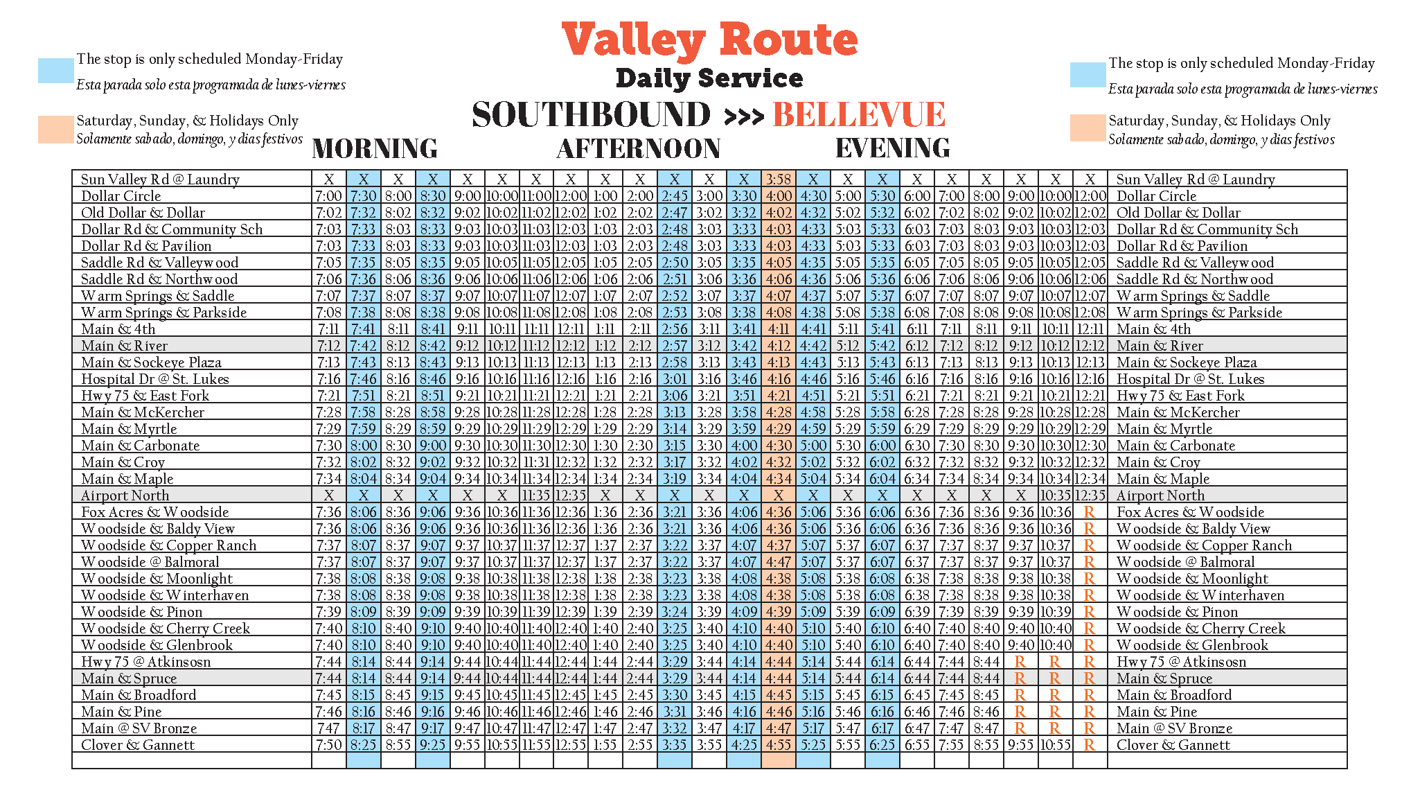 | Hwy 75 & East Fork | 6:29 AM | 6:59 AM | 7:29 AM | 7:59 AM | 8:29 AM | 8:59 AM | 9:29 AM | 10:29 AM | 11:29 AM | 12:29 PM | 1:29 PM | 2:29 PM | 2:59 PM | 3:29 PM | 4:19 PM | 4:29 PM | 5:29 PM | 6:29 PM | 7:29 PM | 8:29 PM | 9:29 PM | 10:59 PM |