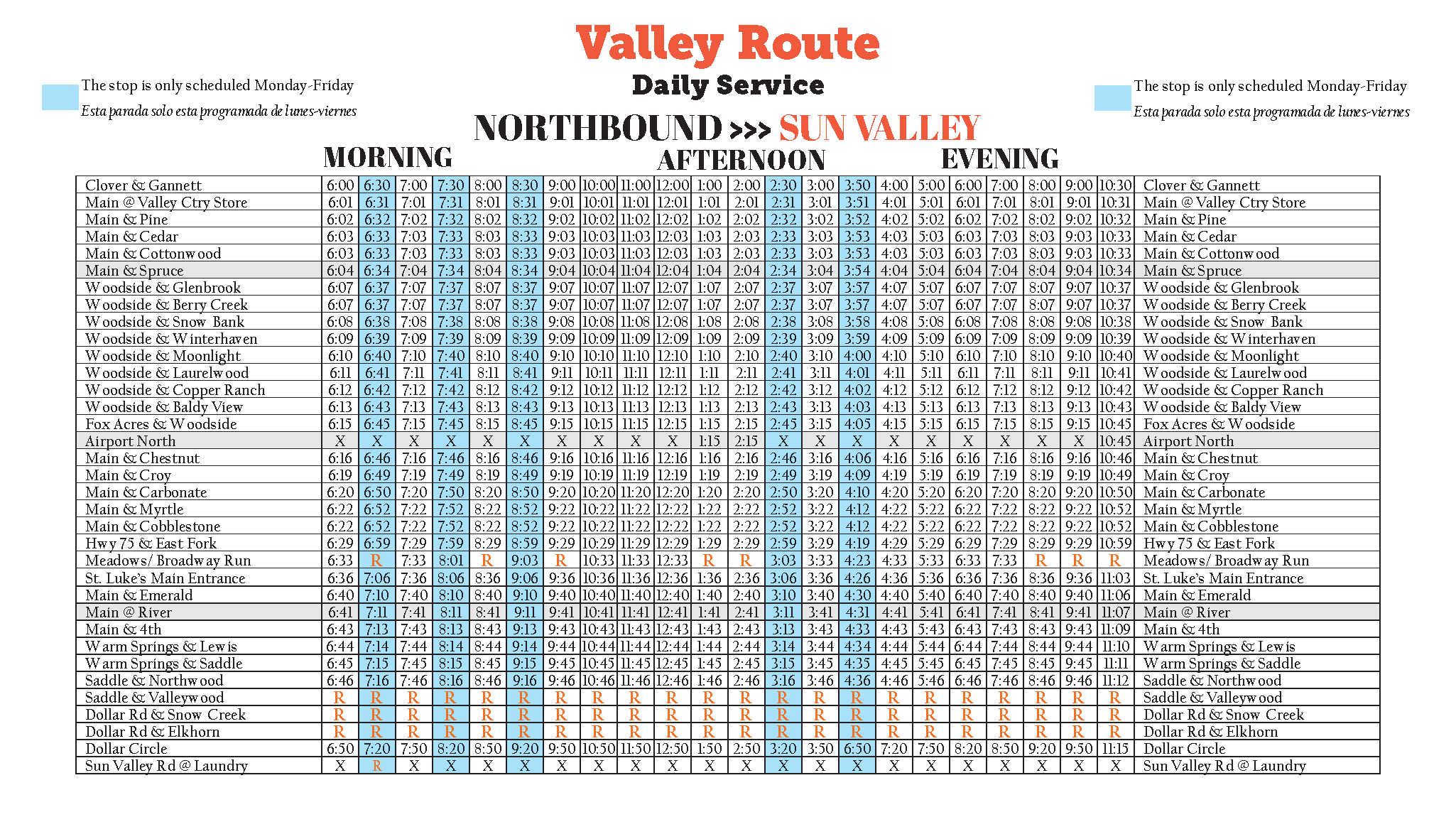 | Sun Valley Rd @ Laundry | X | R | X | X | X | X | X | X | X | X | X | X | X | X | X | X | X | X | X | X | X | X |